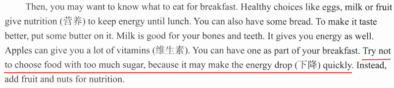 4. 答案: The writer tells us not to choose food with too much sugar because it may make the energy drop quickly.
