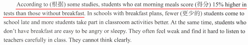 根据一些研究,吃早餐的学生在测试中的得分比不吃早餐的学生高15%。在有早餐计划的学校里,更少的学生迟到,更多的学生能更好地参与课堂活动。同时,不吃早餐的学生容易生气或犯困。他们经常感到虚弱,发现很难在课堂上认真听老师讲课,无法清晰思考。