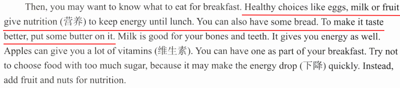 第三段第1-3行提到“Healthy choices like eggs, milk or fruit give nutrition to keep energy until lunch. You can also have some bread. To make it taste better, put some butter on it.”(像鸡蛋、牛奶或水果这样的健康选择能提供营养,让你保持能量直到午餐时间。你也可以吃一些面包,为了让它更好吃,可以在上面涂些黄油),整理这些内容即可。