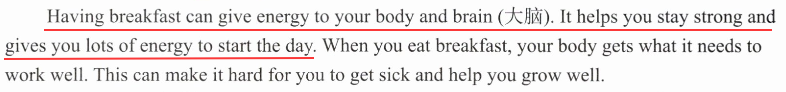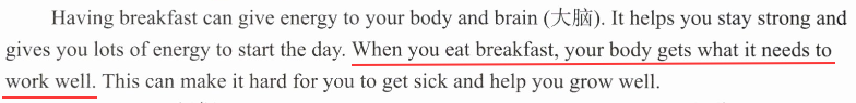 1. 答案: When you have breakfast, your body gets what it needs to work well.