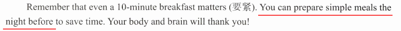 第四段第2行提到“You can prepare simple meals the night before to save time.”(你可以在前一天晚上准备简单的餐食来节省时间),直接提取这句话。