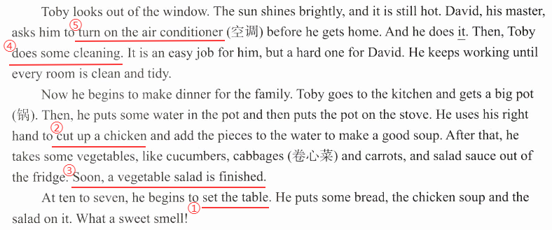 选项含义:① 摆餐具;② 切碎鸡肉;③ 做沙拉;④ 打扫房子;⑤ 打开空调;A. ⑤④②③①;B. ⑤④③②①;C. ③④①⑤②;D. ④③②⑤①