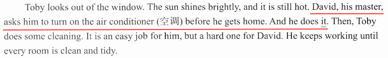 第二段第1-2行提到“David, his master, asks him to turn on the air conditioner before he gets home. And he does it.”(他的主人大卫让他在自己回家前打开空调。他照做了),所以“it”指的是打开空调,选D。