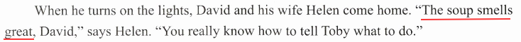 当他打开灯时,大卫和他的妻子海伦回到了家。“这汤闻起来很棒,大卫,”海伦说,“你真的很会吩咐托比做事。”