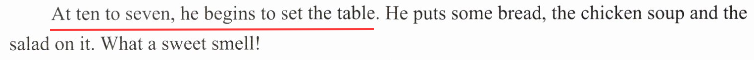 在六点五十,他开始摆餐具。他把一些面包、鸡汤和沙拉放在餐桌上。多么香甜的气味啊!