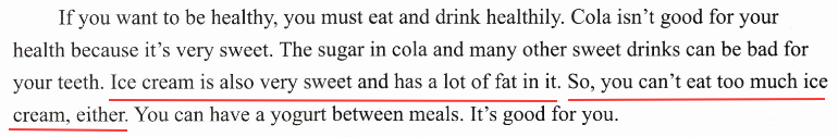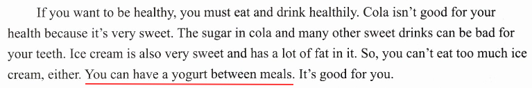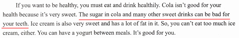 如果你想要健康,你必须饮食健康。可乐对你的健康不好,因为它非常甜。可乐和许多其他甜饮料中的糖会对你的牙齿有害。冰淇淋也非常甜,并且含有大量脂肪。所以,你也不能吃太多冰淇淋。你可以在两餐之间喝一份酸奶,它对你有好处。