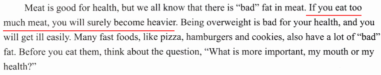 4. 答案: Because if you eat too much meat, you will surely become heavier.