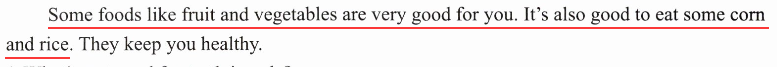 一些食物,比如水果和蔬菜,对你非常有好处。吃一些玉米和米饭也很好,它们能让你保持健康。