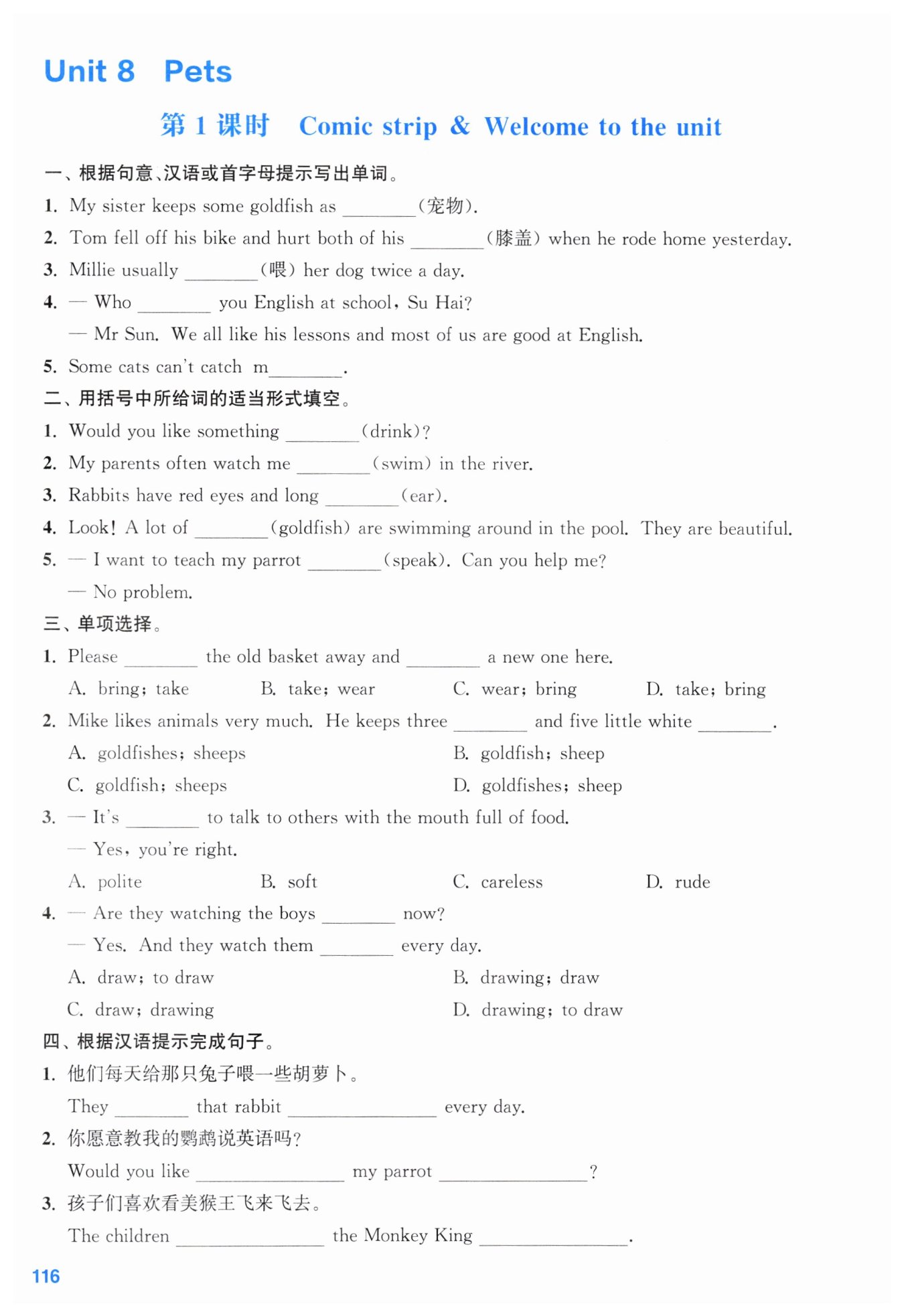 题干中两空前为数字three,和five,故横线处需用名词复数,goldfish的复数为原形;sheep的复数为原形,故本题选B。