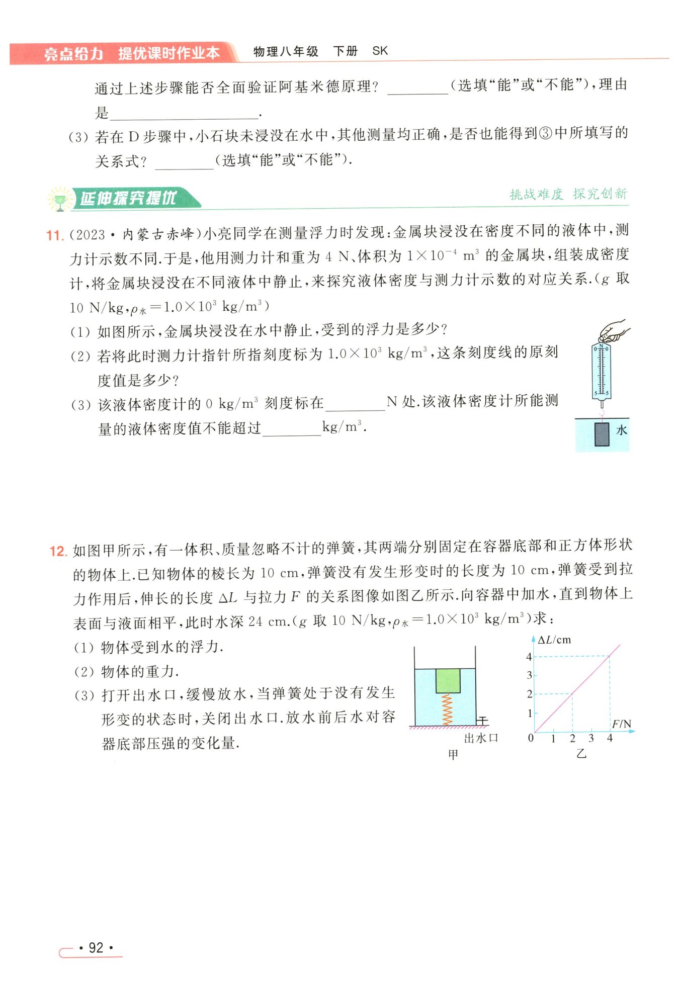 $V_{排}'=\frac {F_{浮}'}{ρ_{水}\ \mathrm {g}}=\frac {6\ \mathrm {N}}{1.0×10^3\ \mathrm {kg/m^3}×10\ \mathrm {N/kg}}=6×10^{-4}\ \mathrm {m^3},$