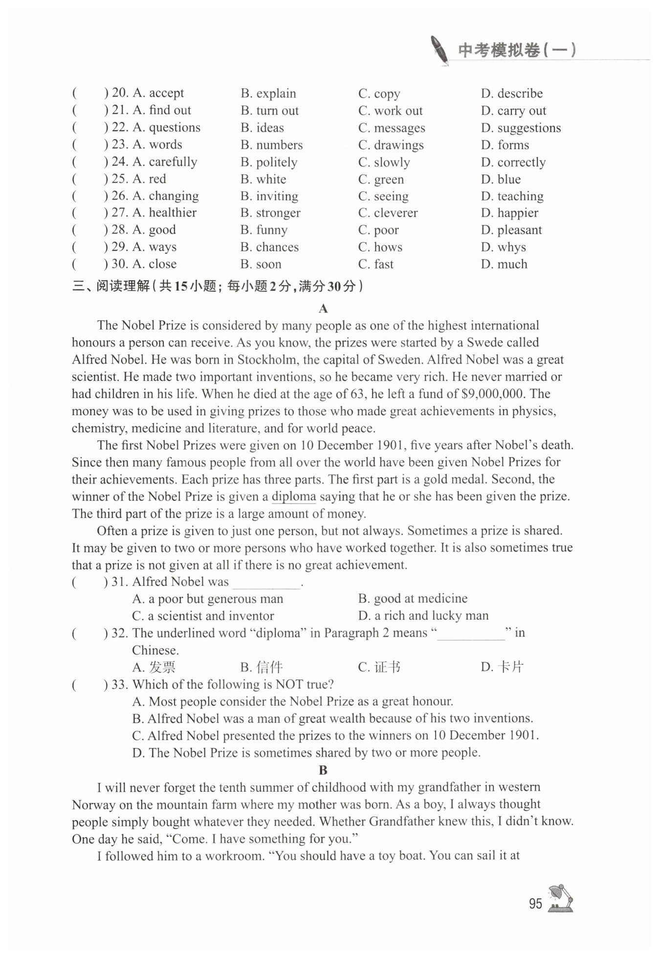 根据第二段第一行The first Nobel Prizes were given on 10 December 1901, five years after Nobel's death.(第一届诺贝尔奖于1901年12月10日颁发,也就是诺贝尔去世5年后。)可知,1921年诺贝尔已经去世5年了,不可能为获奖者颁奖,所以C说法错误,故选C。