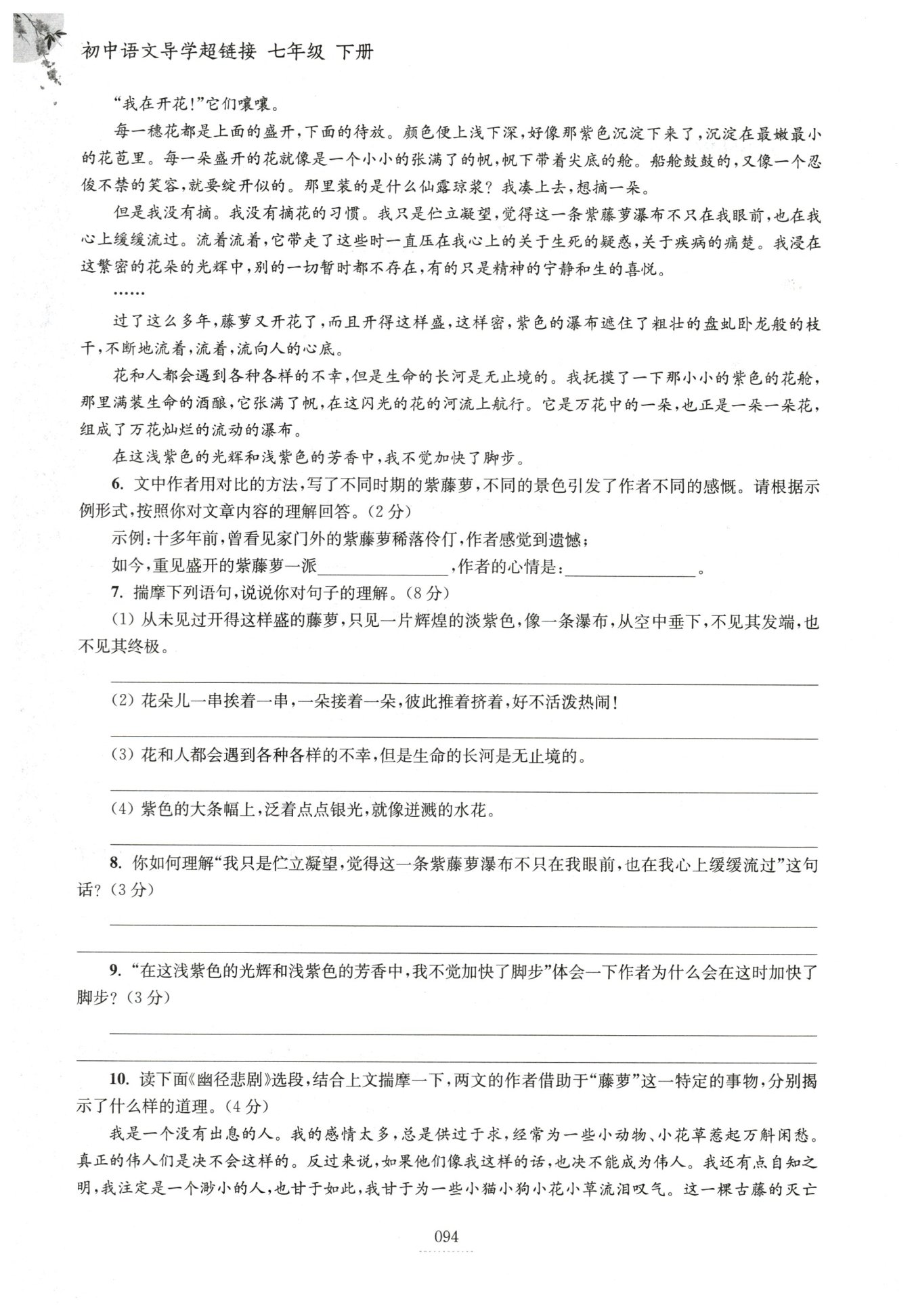 看着眼前的藤萝瀑布,心中对人生有了新的感悟,眼前的藤萝使作者对人生有了更新的