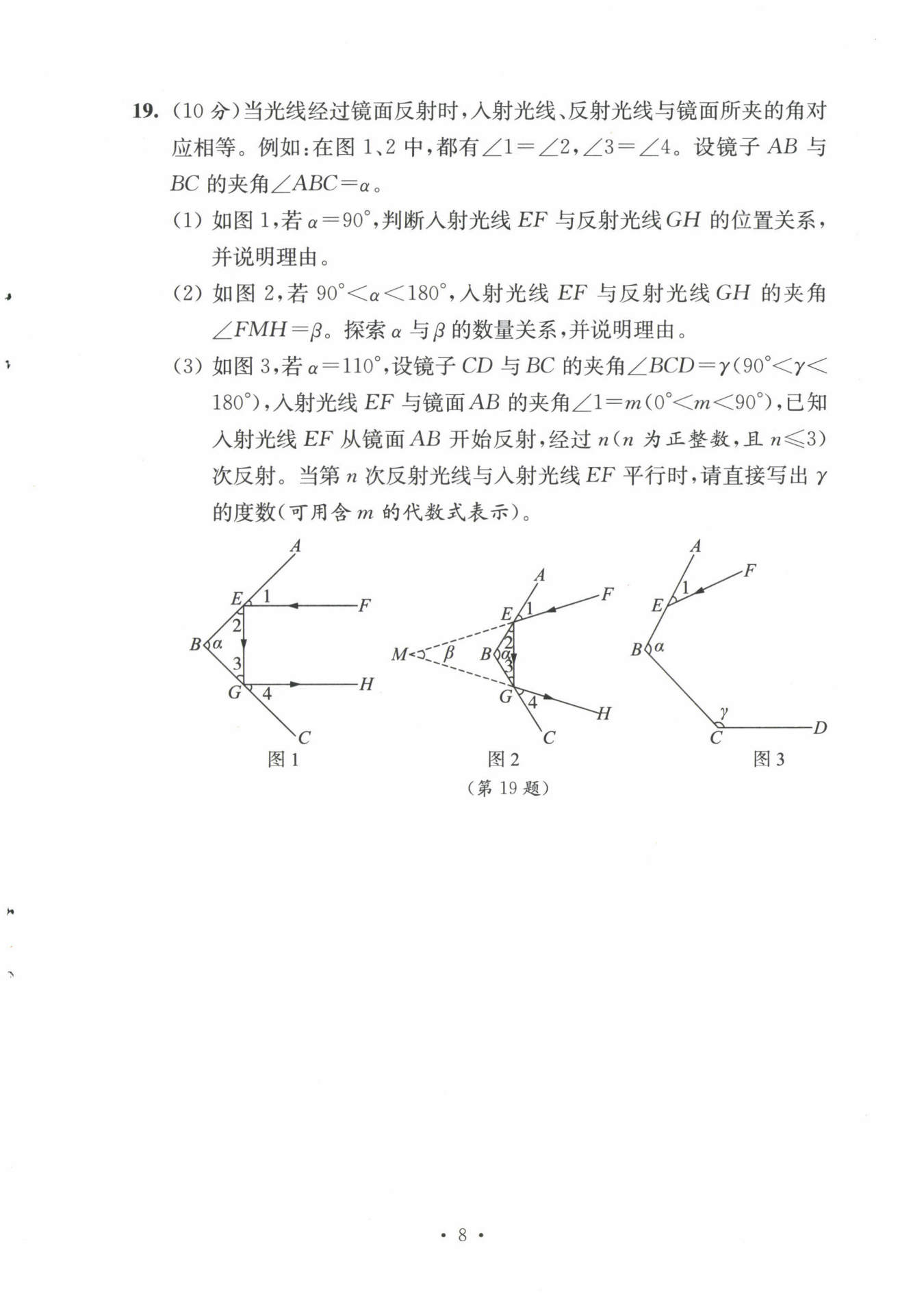 ②当$ n=2 $时, 如果在$ B C $边反射后与$ E F $平行, 则$ α=90° ,$与题意不符;