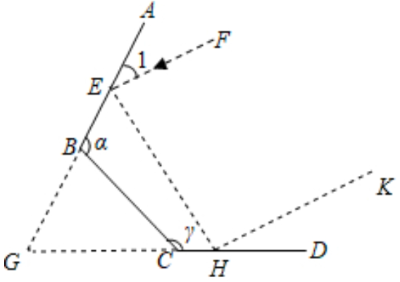 由$EF//HK,$且由$(1)$的结论可得,$∠G=γ-60°=90°,$则$γ=150°.$
