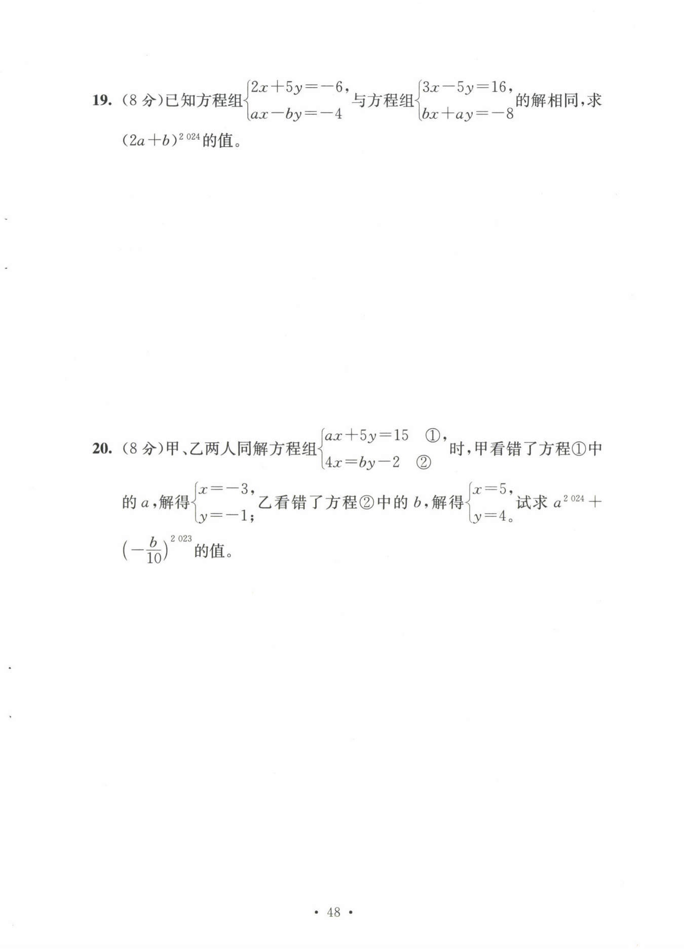 $将\ \left\{\begin{array}{l}x=2 \\ y=-2\end{array}\right.\ 分别代入a x-b y=-4 ,b x+a y=-8 \text { 中得 }\left\{\begin{array}{l}2a+2b=-4 \\2b-2a=-8\end{array}\right. \text {, }$