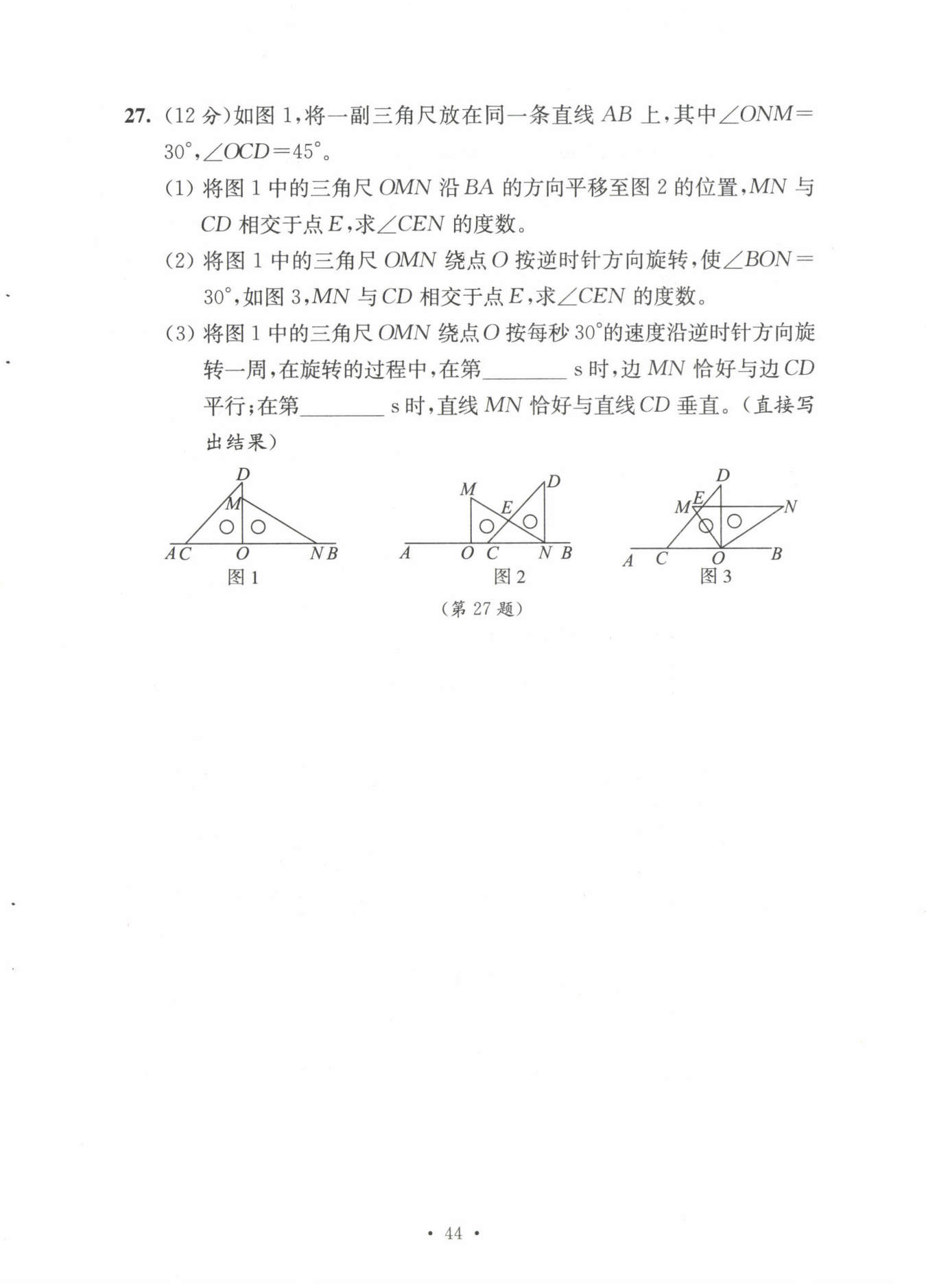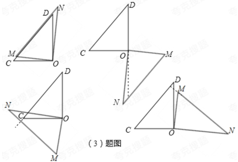 $(3)$如图$, {MN}\ \mathrm {/} / {CD} $时, 旋转角为$ 90°-(60°-45°)=7 5° ,$