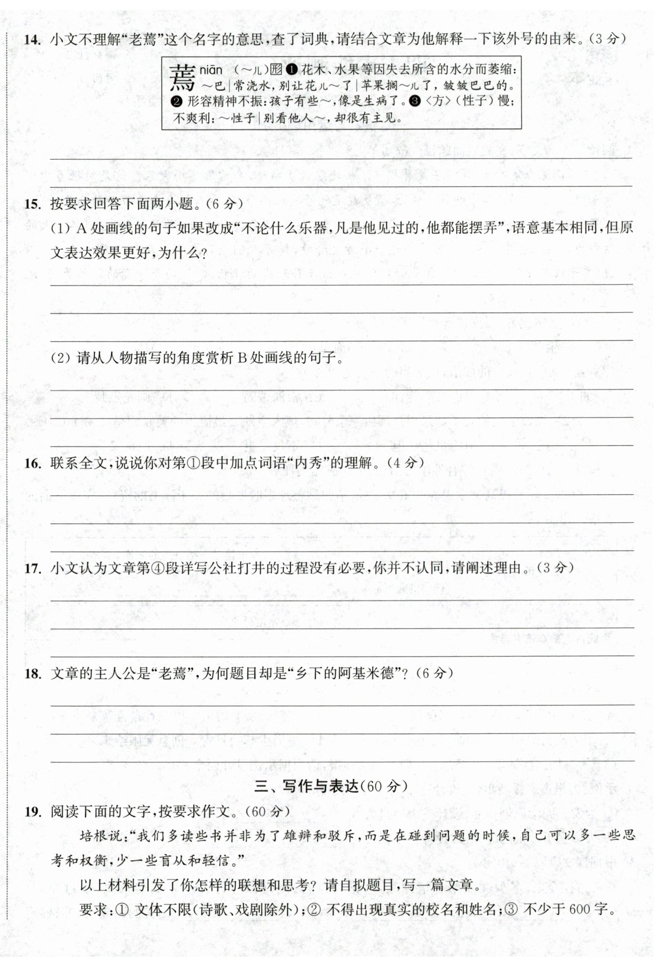 攻;老蔫则利用物理知识设计器械升起了井锥,帮助大家挽回了损失;作者以“乡下的阿基