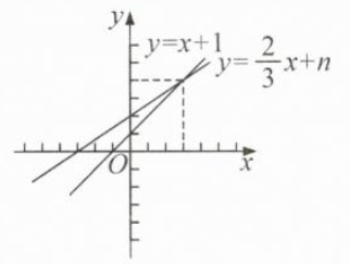 $解:(2)由(1)得该函数的表达式为y=x+1.$ $令 x=3,得y=4.$ $因为当x<3时,$ $函数y=\frac{2}{3}\ \mathrm {n}的值大于函数y=x+1 的值且小于4,$ $所以画出函数图像如图所示,$ $即直线y=\frac{2}{3}x+n过点(3,4).$ $所以4=\frac{2}{3}×3+n,$ $解得n=2.$ $则n的值为2.$