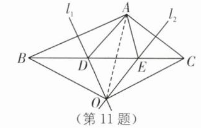 $解:(2)如图,连接OA.$ $∵l_{1}是边AB的垂直平分线,$ $∴OA=OB.\ $ $∵l_{2}是边AC的垂直平分线,$ $∴OA=OC.\ $ $∵OB+OC+BC=32\ \mathrm {cm},BC=12\ \mathrm {cm},\ $ $∴OA=OB=OC=10\ \mathrm {cm}.$