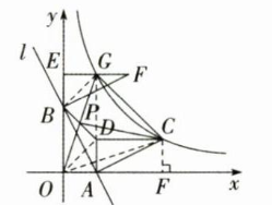 $解:连接OC,OD,GD,BG$ $过点C作CF⊥x轴于点F$ $由(1),可知EG=OA=a$ $∴易得点A,D,G共线$ $∴ 易得四边形OAGE是矩形$ $∴ AG//OE,AG=OE$ $∵易得OB=DG$ $∴四边形OBGD是平行四边形$ $∴OP=GP$ $∵△PGC的面积为4$ $∴△OGC的面积为8$ $∵S_{△OAG}=S_{△OCF}=\frac{1}{2}k$ $∴S_{△OGC}=S_{△OAG}+S_{梯形AGCF}-S_{△OCF}$ $=S_{梯形AGCF}=8$ $∴\frac{1}{2}(AG+CF)AF=8$ $∵b=2a$ $∴AG=a+b=3a,CF=a,AF=b=2a$ $∴\frac{1}{2}(3a+a)×2a=8$ $∵a>0,∴a=\sqrt{2} $
