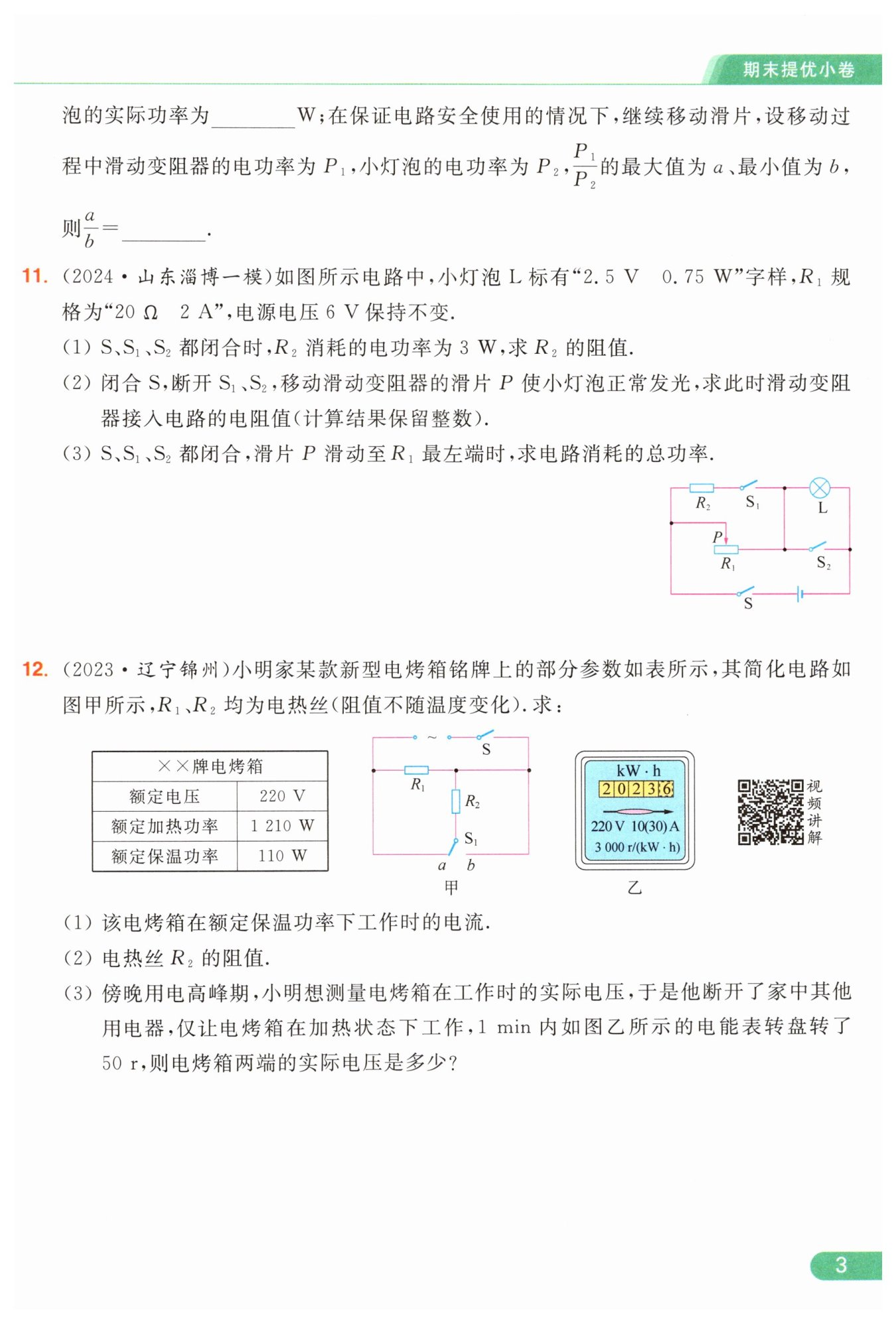 解:$(1) S$、$S_{1}$、$S_{2} $都闭合时,$L $被短路,$R_{2} $与$R_{1} $并联,$R_{2} $消耗的电功率为$3\ \mathrm {W}$,由$P=\frac {U^2}{R}$可得,$R_{2}$的阻值$R_{2}=\frac {U^2}{P_{2}}=\frac {(6\ \mathrm {V})^2}{3\ \mathrm {W}}=12\ \mathrm {Ω}.$