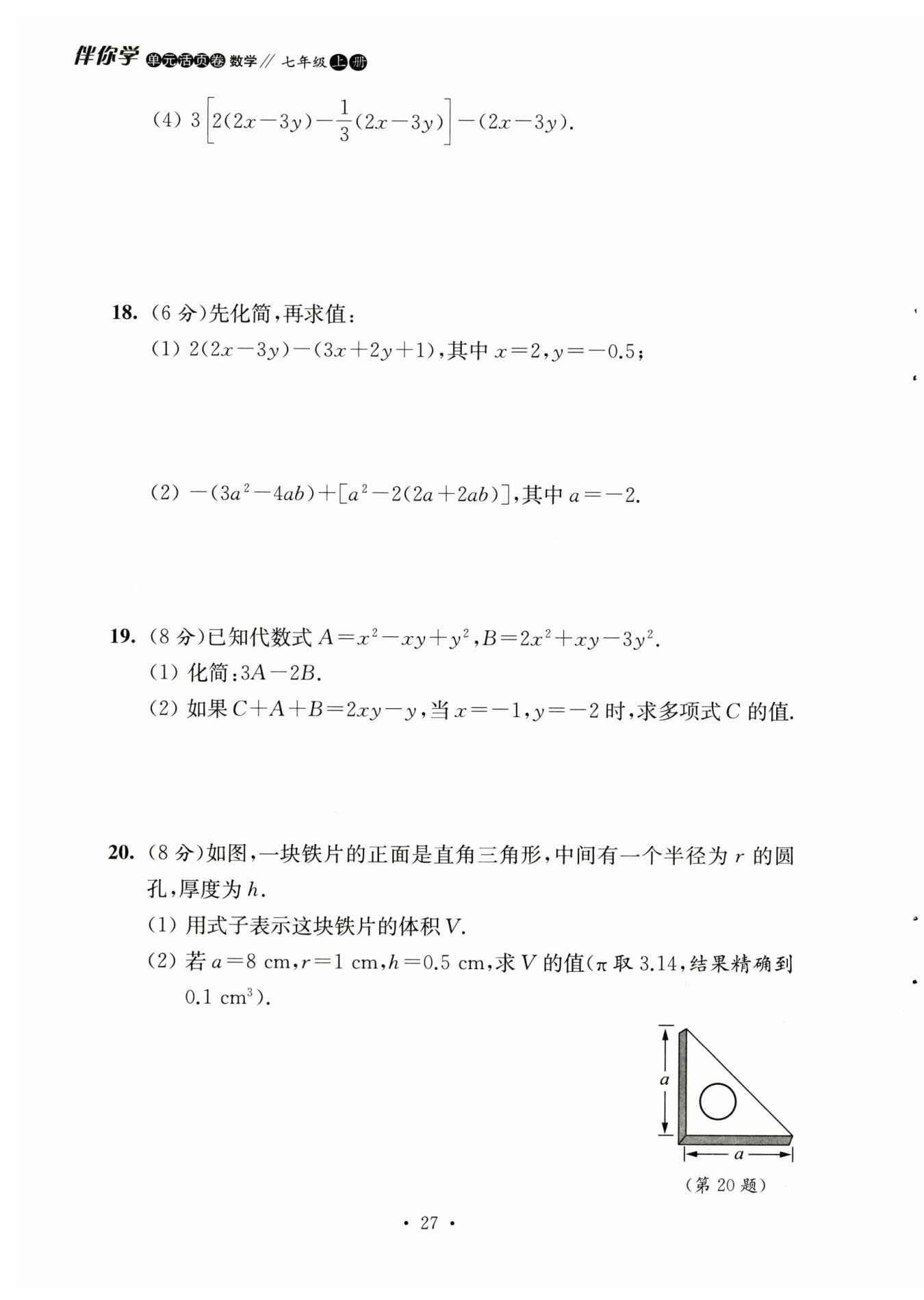 $解:(1)V=(\frac12×a×a-πr^{2})h=\frac12a^{2}h-πr^{2}h$