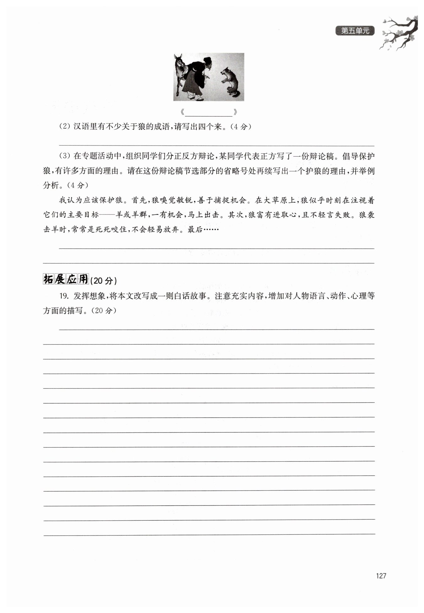 那里的那只狼的眼睛好像闭上了,神情悠闲得很。屠户突然跳起来,用刀砍狼的头,又