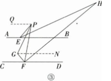 $解:(3)如图③,过点P作PQ//AB,$ $过点G作GN//CD.$ $∵AB//CD,$ $∴PQ//CD//AB//NG.\ $ $∵ EH平分∠BEP,FH平分∠DFP,$ $PG平分∠EPF,FG平分∠PFC,$ $∴ 可设∠PEH=∠HEB=α,∠PFH=∠HFD=β,$ $∠EPG=∠GPF=x,∠PFG=∠GFC=y,$ $则2β+2y=180°.$ $易得2β=2x+2a,$ $∴2x+2a+2y=180°.$ $∴x+y=90°−α.$ $易得∠PGF=∠PGN+∠NGF$ $=2α+x+y=2α+90°−α$ $=90°+α.$ $当PE∥FH时,∠EHF= ∠PEH=α,$ $∴∠PGF−∠EHF=90°$