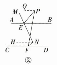 $解:(2)如图②,过点P作PQ//AB$ $过点N作NH//CD.$ $∵AB∥/CD,$ $∴PQ//CD//AB//NH.$ $∴∠AEP+∠QPE=180°,∠QPF=∠PFD.\ $ $∵ EM平分∠AEP,FN平分∠PFD,$ $∴ 可设∠AEM=∠MEP=α,$ $∠PFN=∠NFD=β.$ $∴易得∠PEN+∠EPF$ $=(180°−α)+[2β−(180°−2a)]$ $=α+2β.$ $∵AB//NH//CD,$ $∴∠AEM=∠ENH=α,∠NFD=∠FNH=β.$ $∴∠ENF=∠ENH+∠FNH=α+β.$ $∴∠PFN+∠ENF=β+(a+β)=α+2β.\ $ $∴∠PEN+∠EPF=∠PFN+∠ENF$