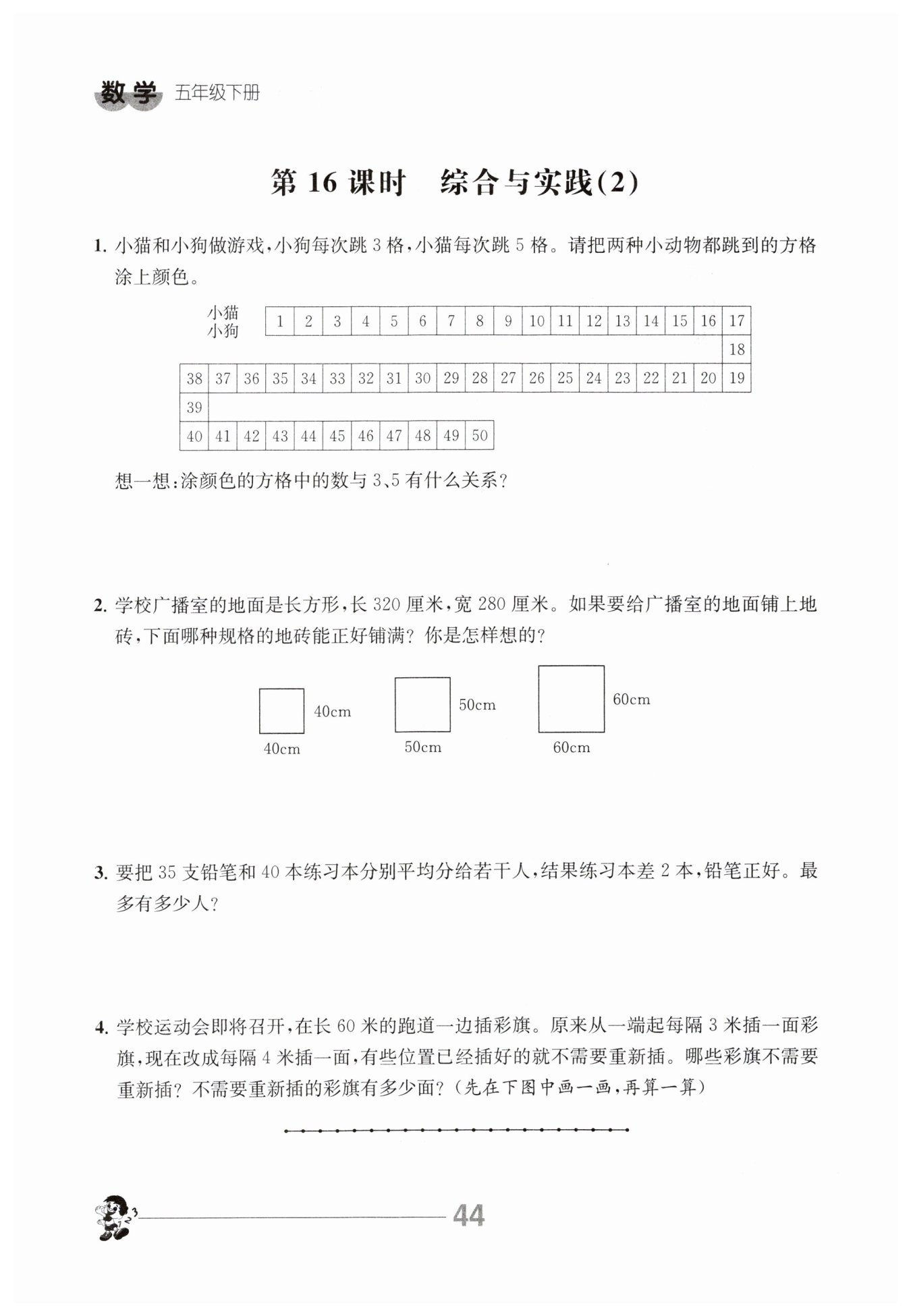 答:选用40cm×40cm 的正方形地砖能正好铺满,因为40是320和280的公因数。