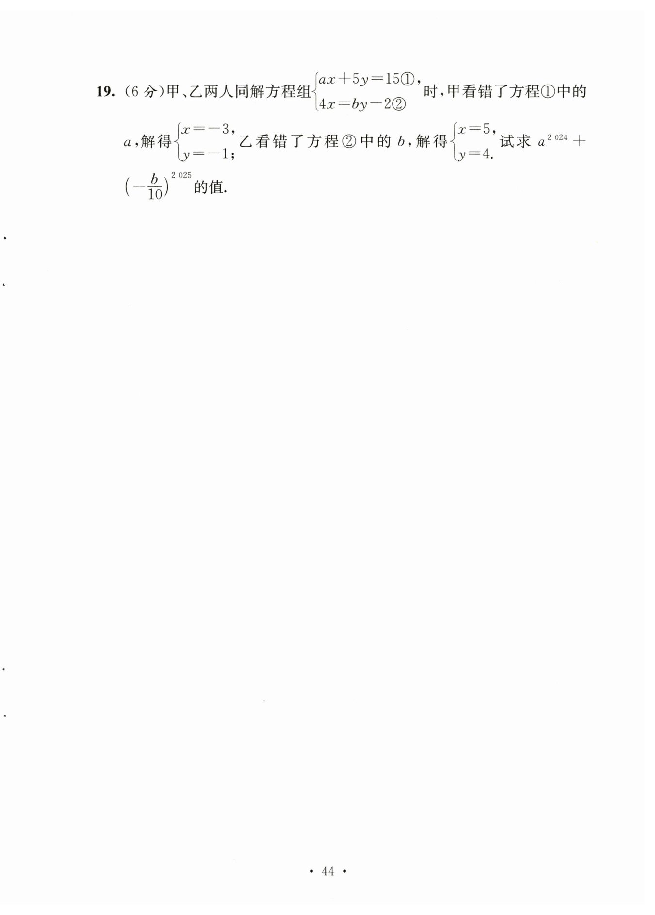 把$\begin{cases}{x=5, }\\{y=4代入方程 ①, 得 5\ \mathrm {a}+5 ×4=15 , 解得 a=-1 .}\end{cases}$