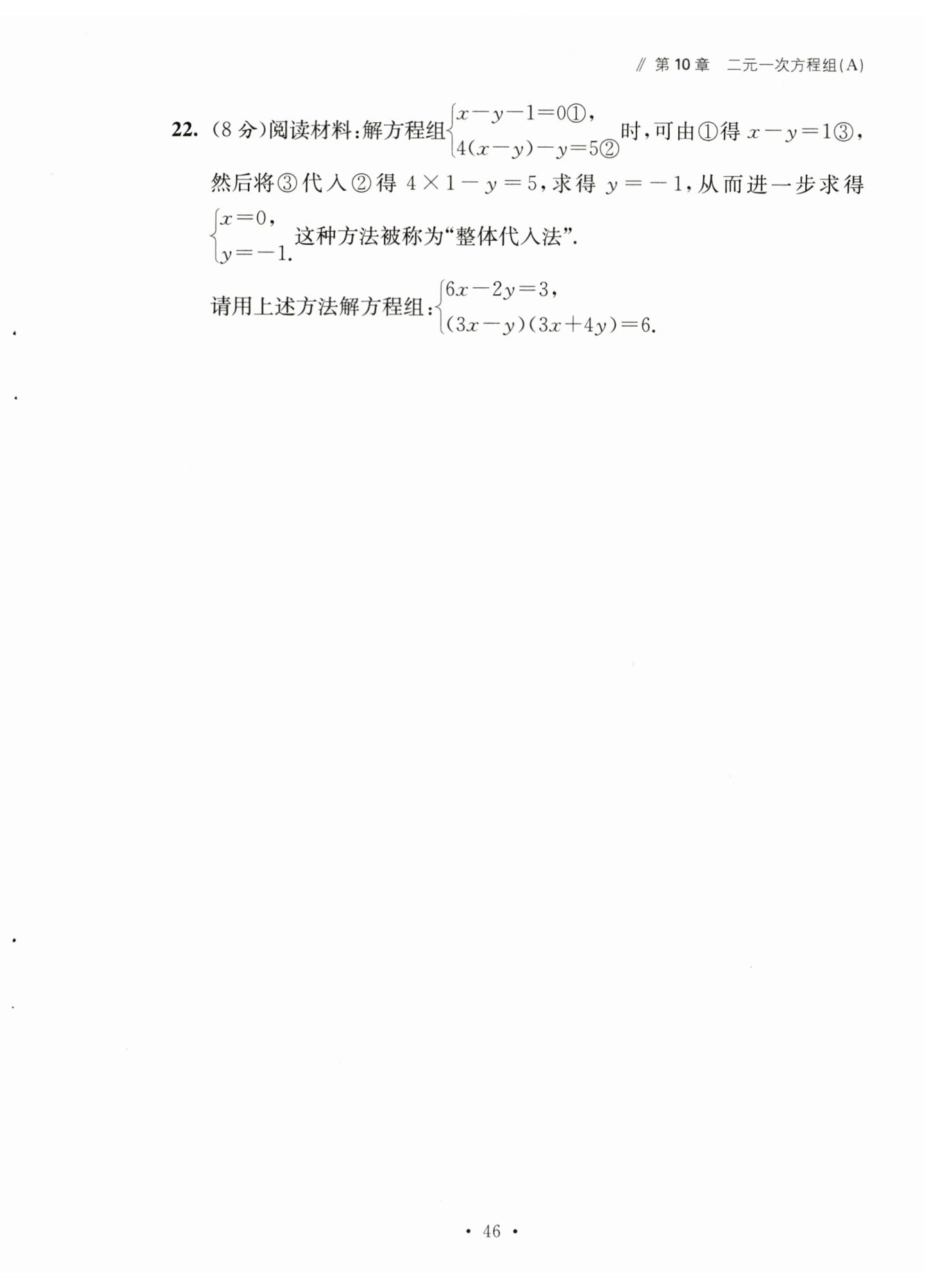 解:由$6x - 2y = 3$得$3x - y=\frac{3}{2}$ $③,$将$③$代入$(3x - y)(3x + 4y)=6$得$\frac{3}{2}(3x + 4y)=6,$$3x + 4y = 4$ $④。$$③×4 + ④$得:$4(3x - y)+3x + 4y = 4×\frac{3}{2}+4,$$12x - 4y+3x + 4y = 6 + 4,$$15x = 10,$解得$x=\frac{2}{3}。$把$x=\frac{2}{3}$代入$③$得:$3×\frac{2}{3}-y=\frac{3}{2},$$2 - y=\frac{3}{2},$解得$y=\frac{1}{2}。$所以方程组的解为$\begin{cases}x=\frac{2}{3} \\ y=\frac{1}{2}\end{cases}$