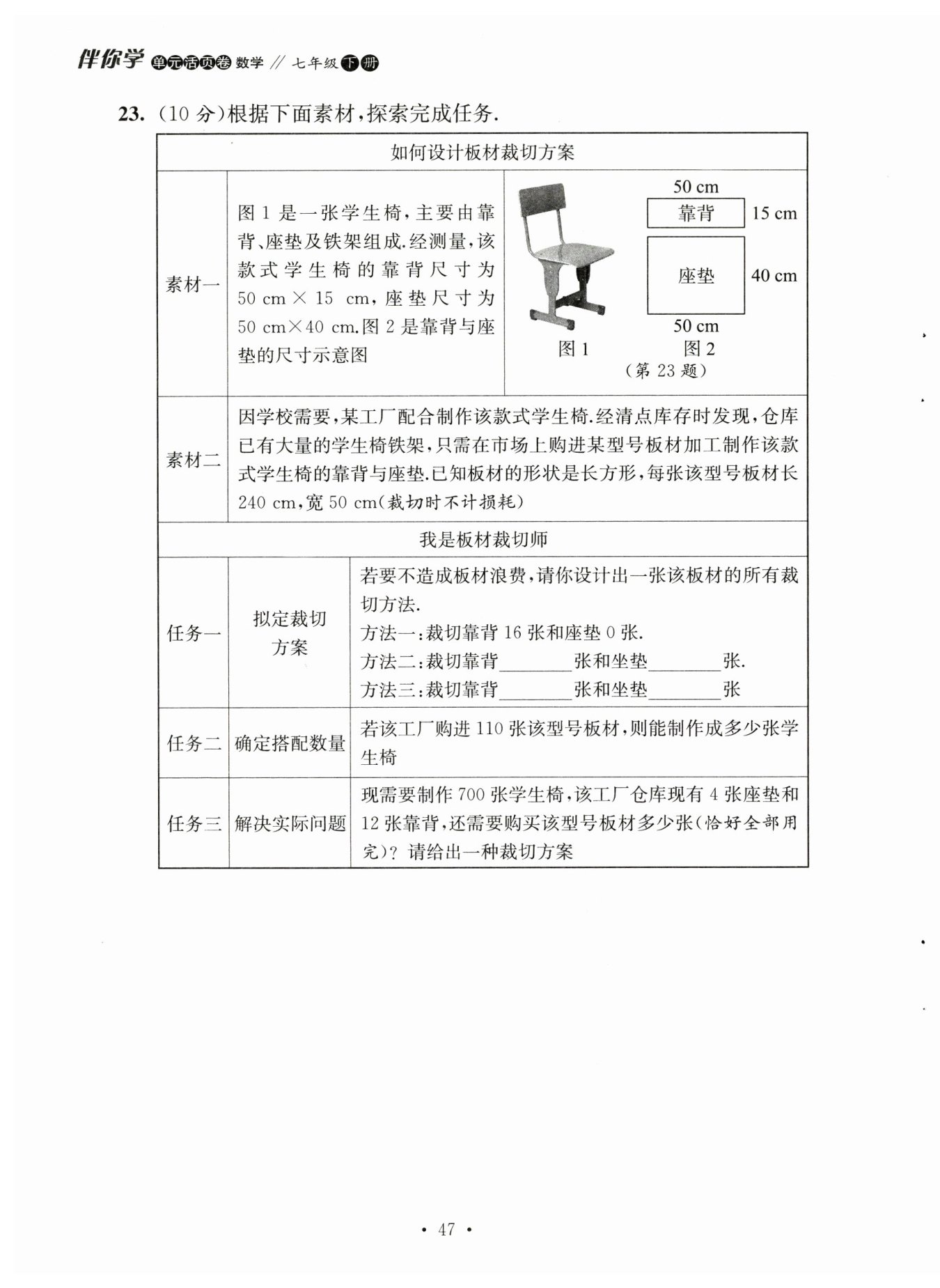 $解:任务一:设一张该板材裁切靠背\ m\ 张, 坐垫\ n 张,$