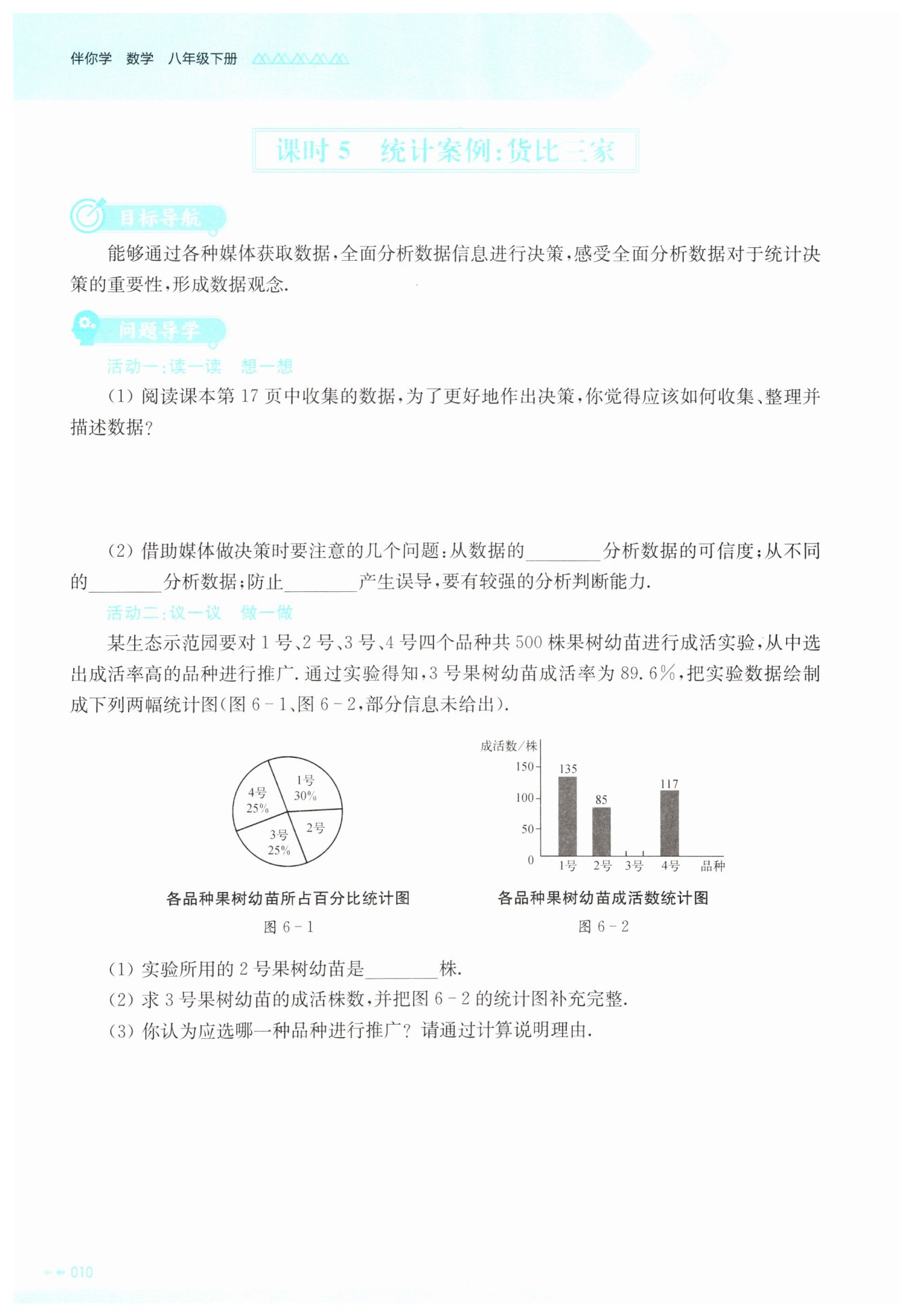 本题结合扇形统计图与条形统计图的信息,考查百分比与成活率的计算,需灵活运用两种统计图的特点提取数据,提升数据处理能力。