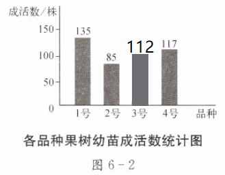 (2) 3号果树幼苗成活株数为$\boldsymbol{112}$株,统计图补充为在3号位置绘制高度为112的直条