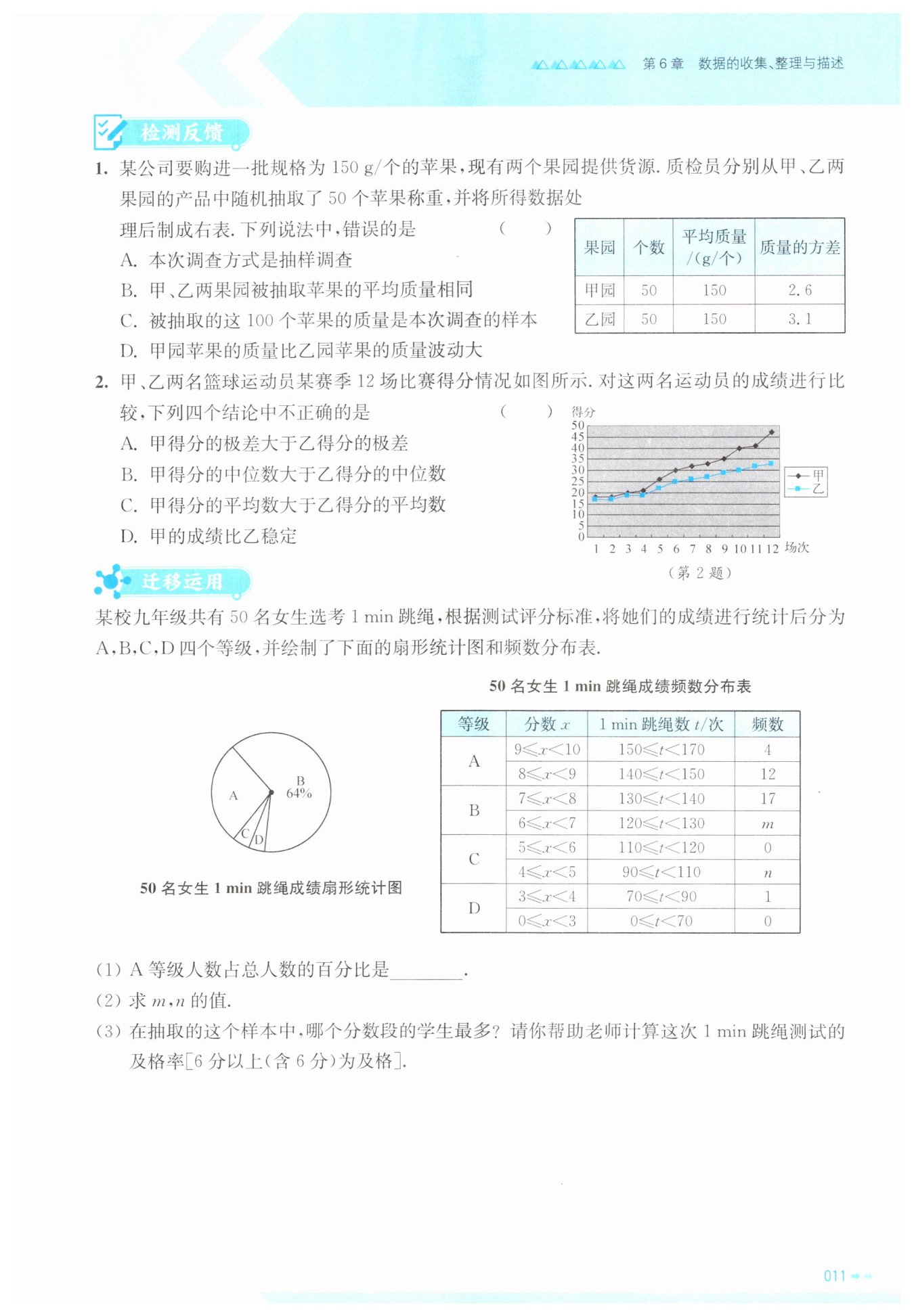 选项D:甲的得分波动幅度大于乙,说明乙的成绩比甲稳定,D错误。