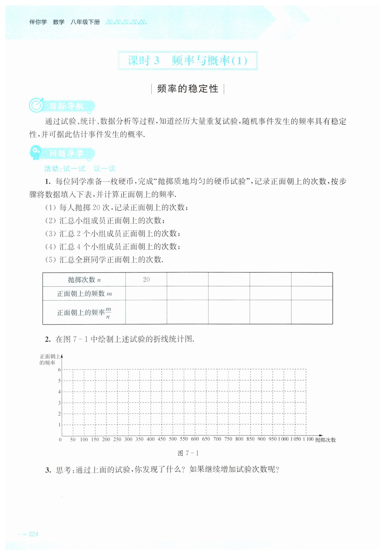 3. 发现:随着试验次数增加,正面朝上的频率逐渐稳定在0.5左右;继续增加次数,频率会更接近0.5。