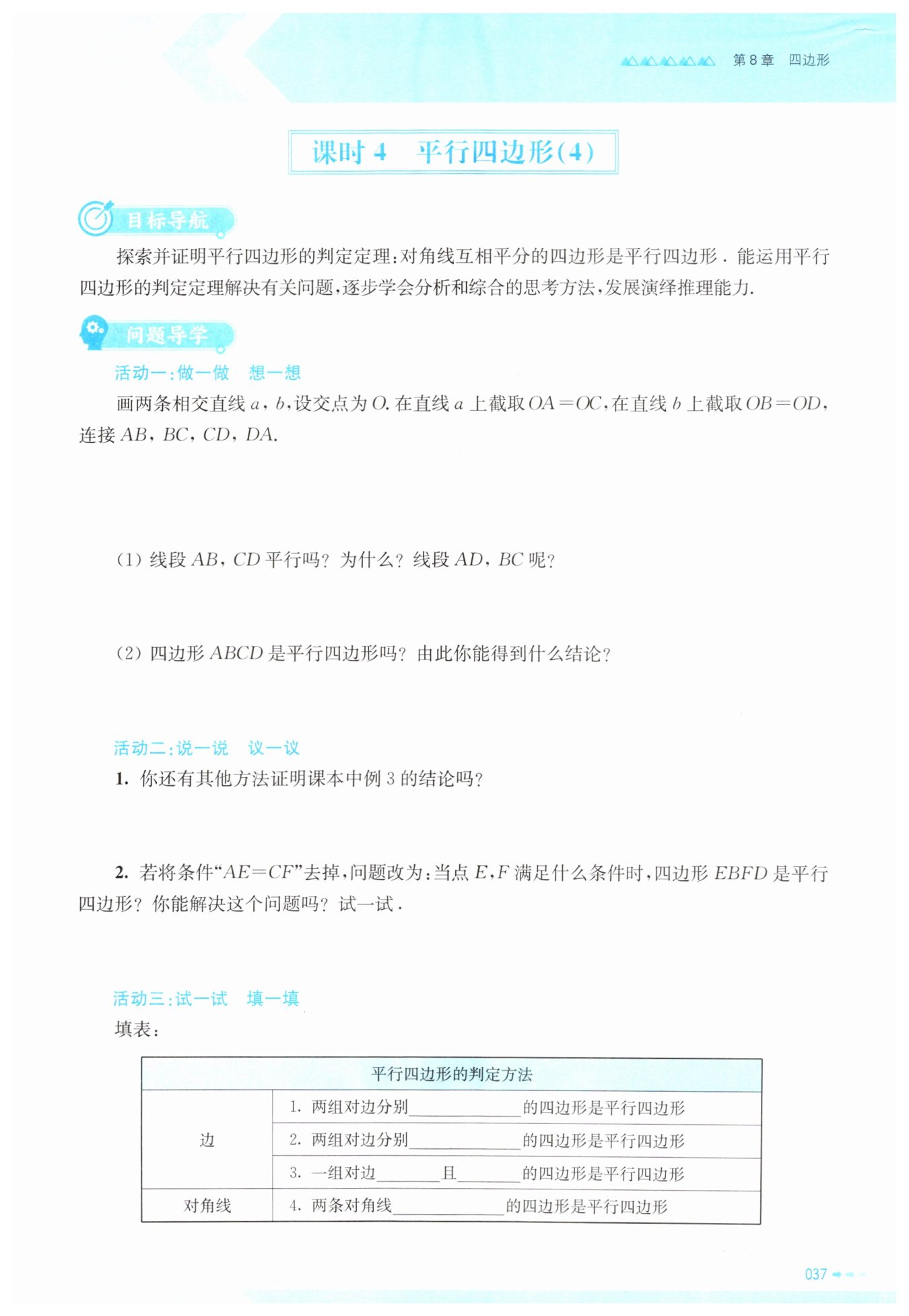 本题通过构造全等三角形推导平行线,进而探究平行四边形的判定定理,考查了全等三角形与平行四边形相关知识的综合运用,培养几何逻辑推理能力。