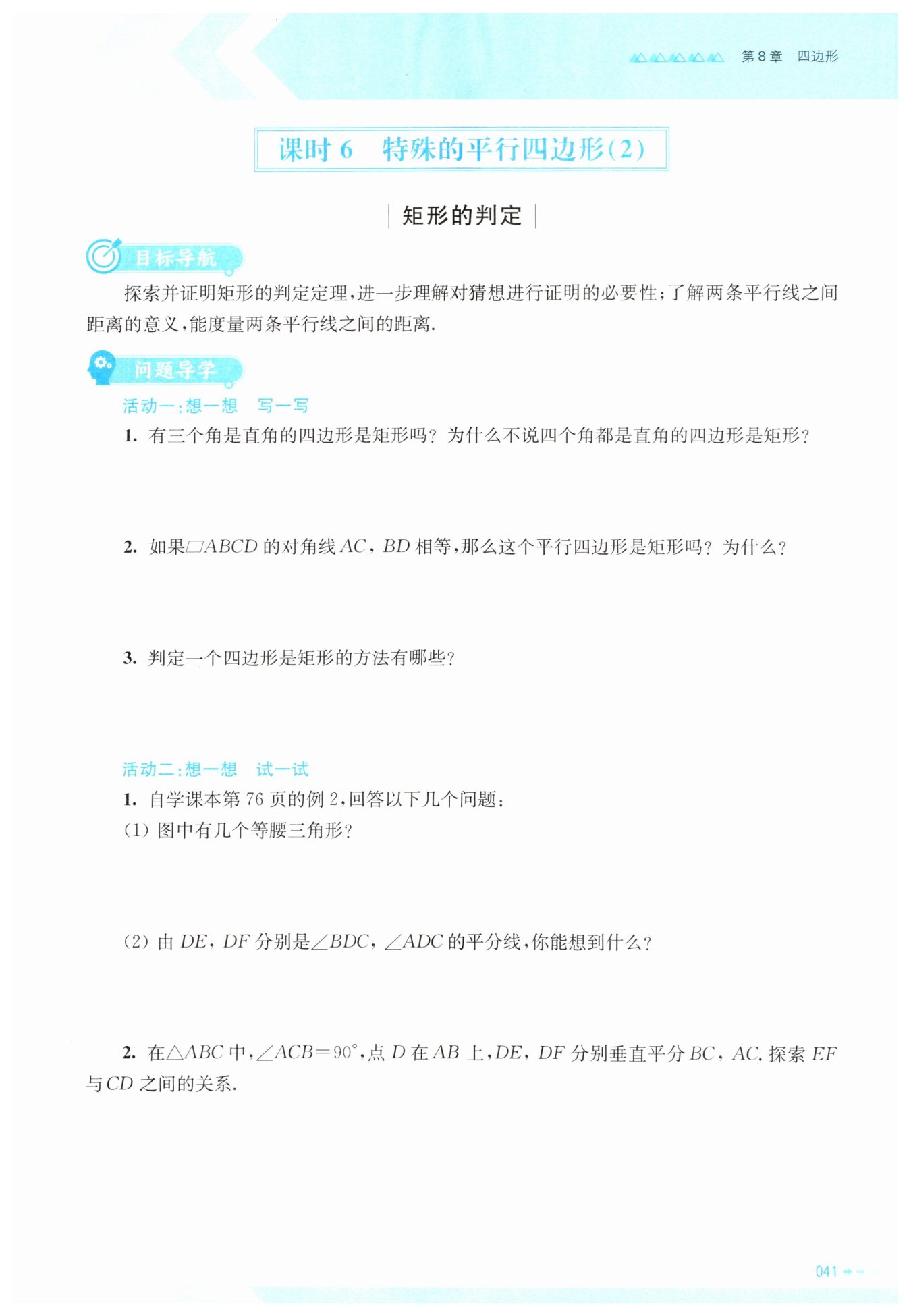 本题围绕矩形判定的核心知识展开,通过推导判定依据,帮助理解判定条件的合理性与简化性,夯实矩形判定的基础,提升逻辑推理能力。