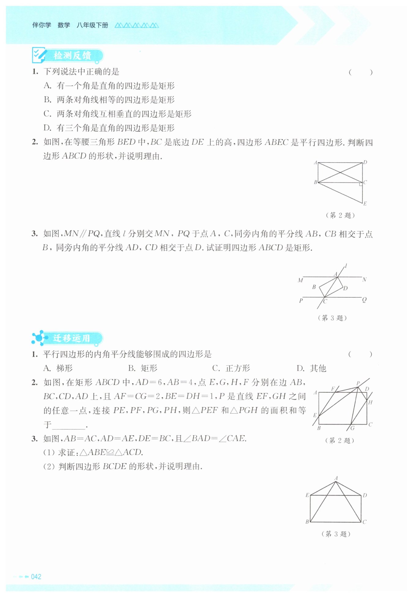 4. 又因为$∠ BCD=90°$,根据“有一个角是直角的平行四边形是矩形”,可判定平行四边形$ABCD$是矩形。
