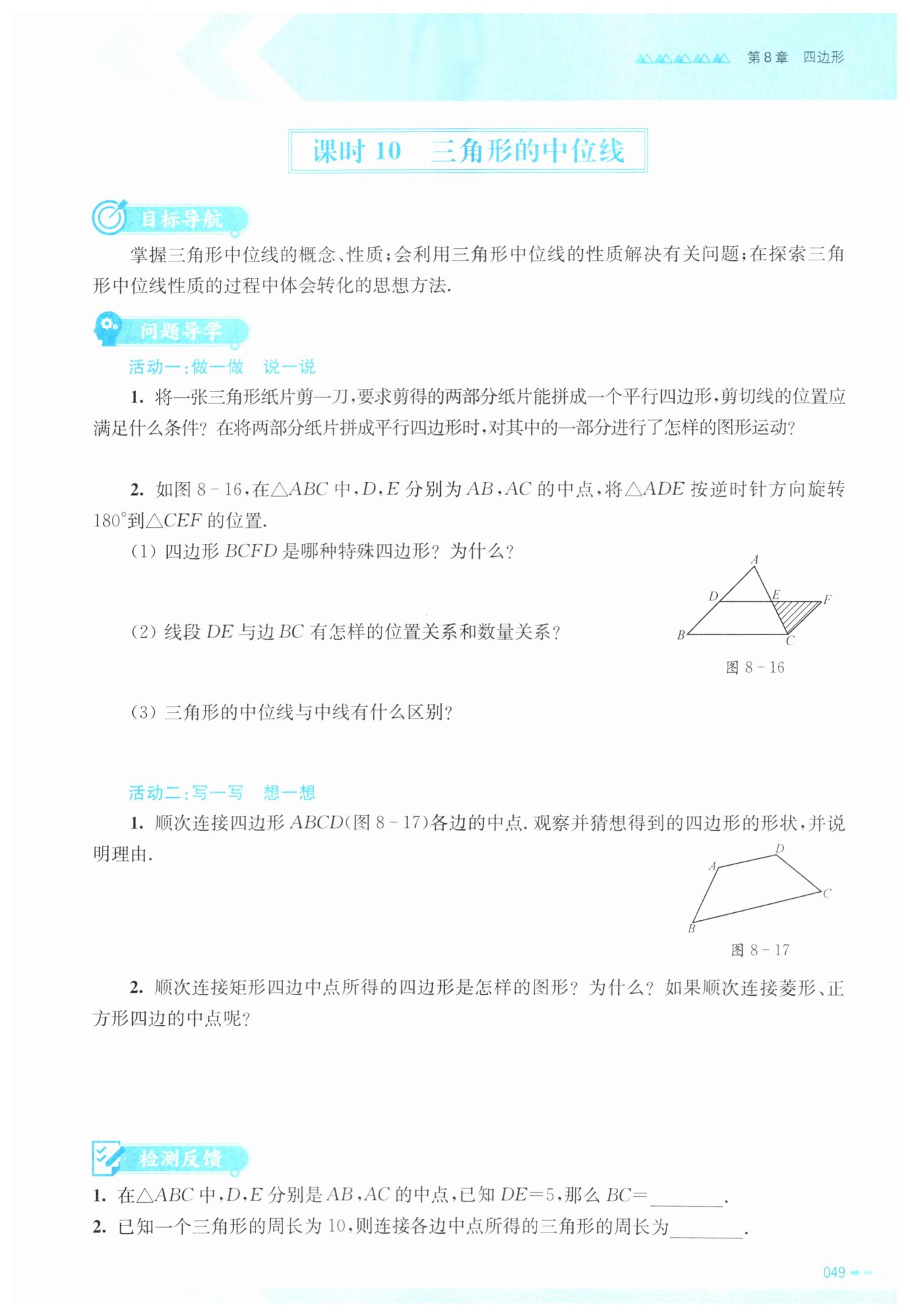 (3)三角形的中位线是连接三角形两边中点的线段,不经过三角形的顶点,不平分三角形的面积,三角形的中线是连接三角形一个顶点和对边中点的线段,不与任何一边平行,平分三角形的面积(合理即可)。