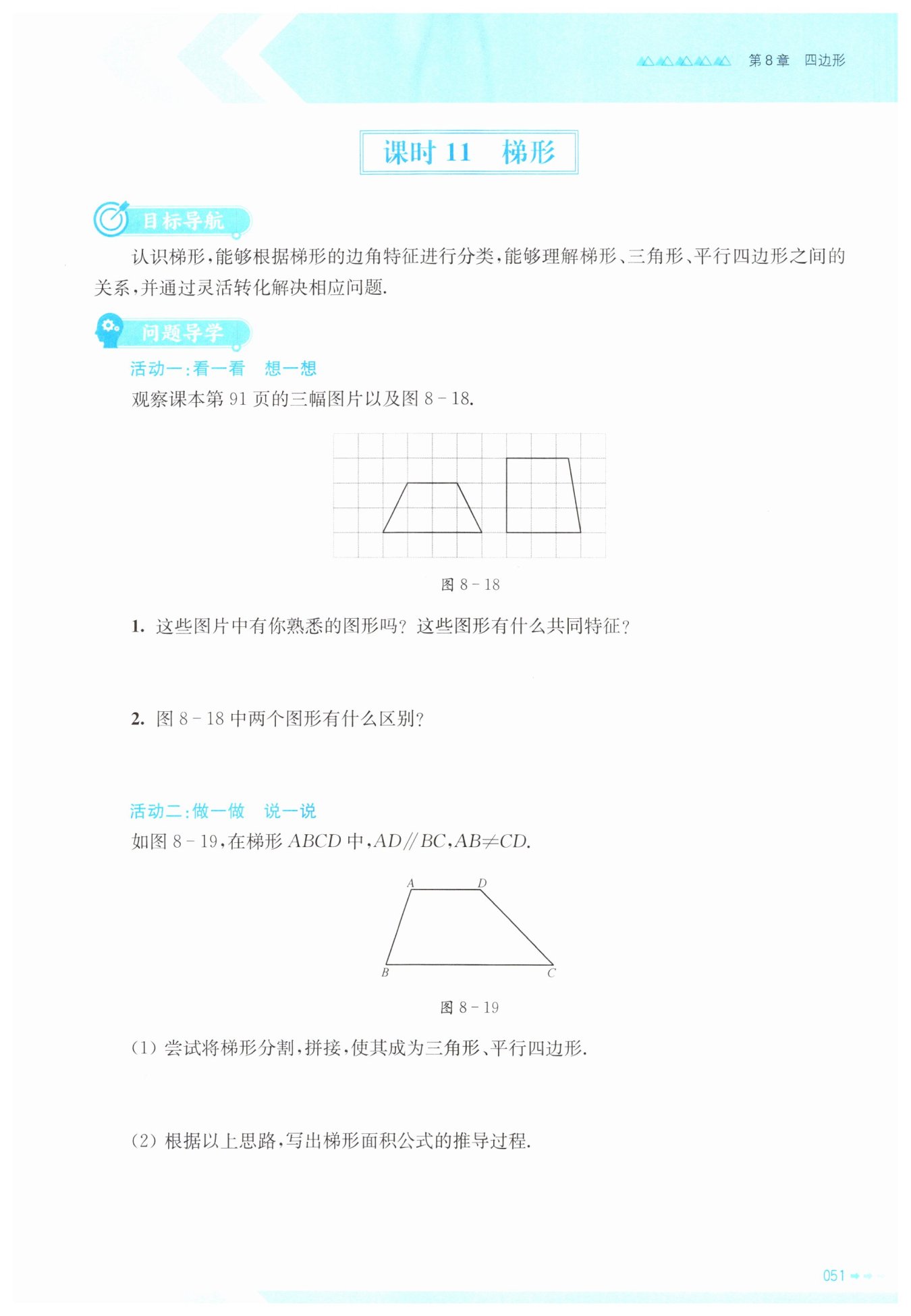 本题通过梯形的分割拼接,将未知的梯形面积问题转化为已知的三角形、平行四边形面积问题,体现了转化与化归的数学思想,需掌握常见的梯形割补方法,理解面积公式的推导逻辑。
