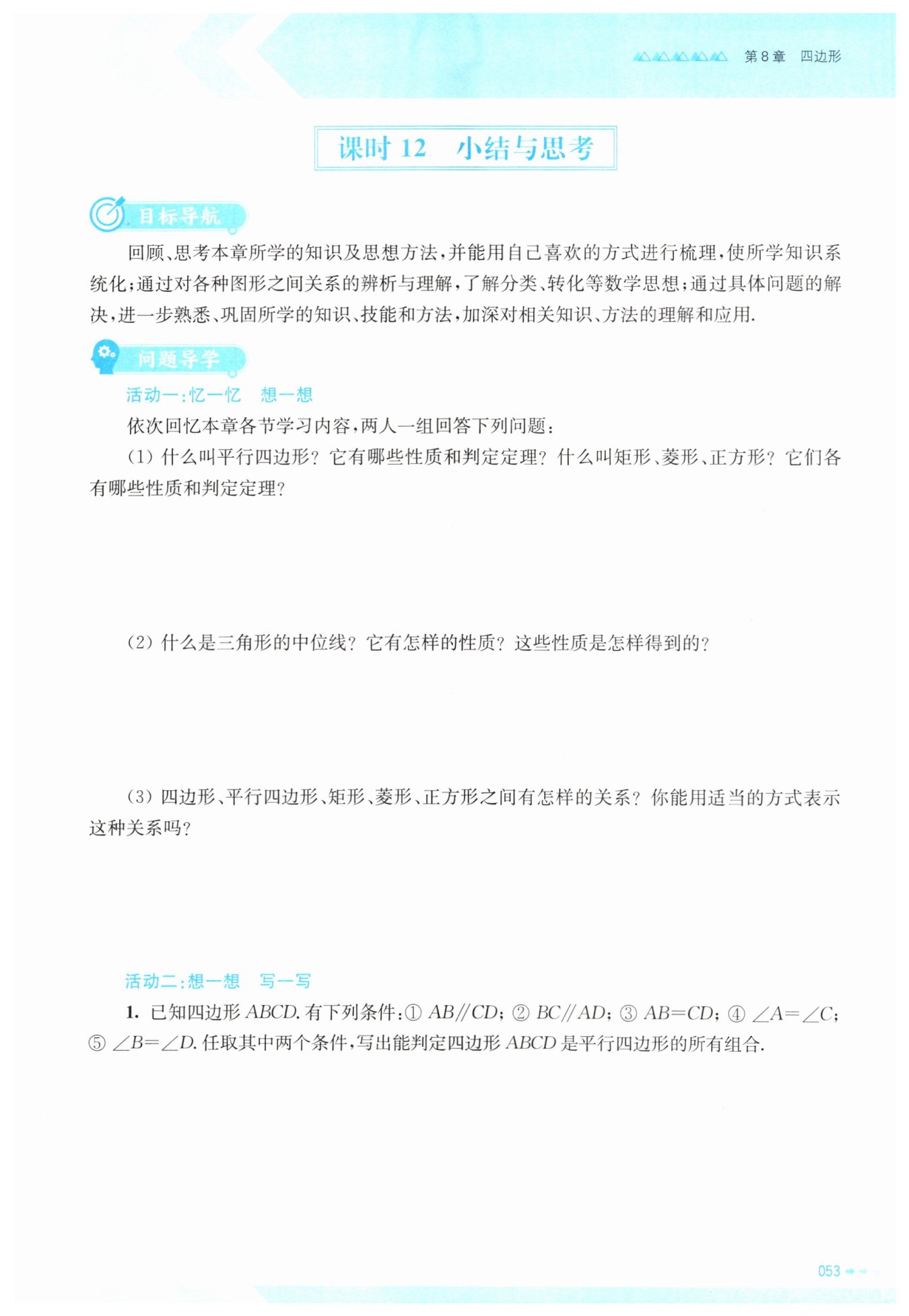 2. 对角相等,$∠ A=∠ C$,$∠ B = ∠ D$,邻角互补,$∠ A+∠ B = 180^{\circ}$;