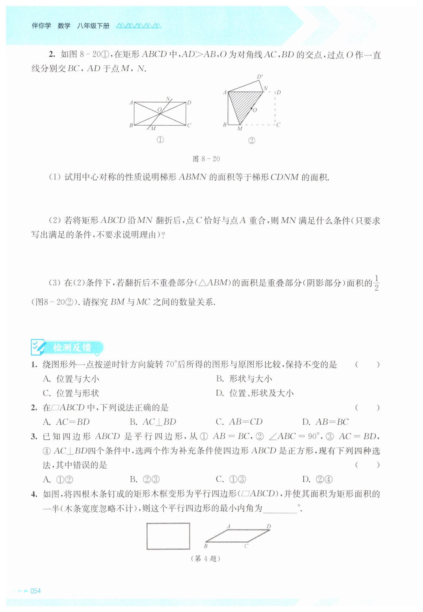 (1) 矩形$ABCD$是中心对称图形,对称中心为对角线交点$O$。直线$MN$过点$O$,故点$M$与$N$、点$B$与$D$、点$A$与$C$分别关于点$O$对称,因此梯形$ABMN$与梯形$CDNM$关于点$O$中心对称,根据中心对称的性质,成中心对称的两个图形面积相等,所以梯形$ABMN$的面积等于梯形$CDNM$的面积。