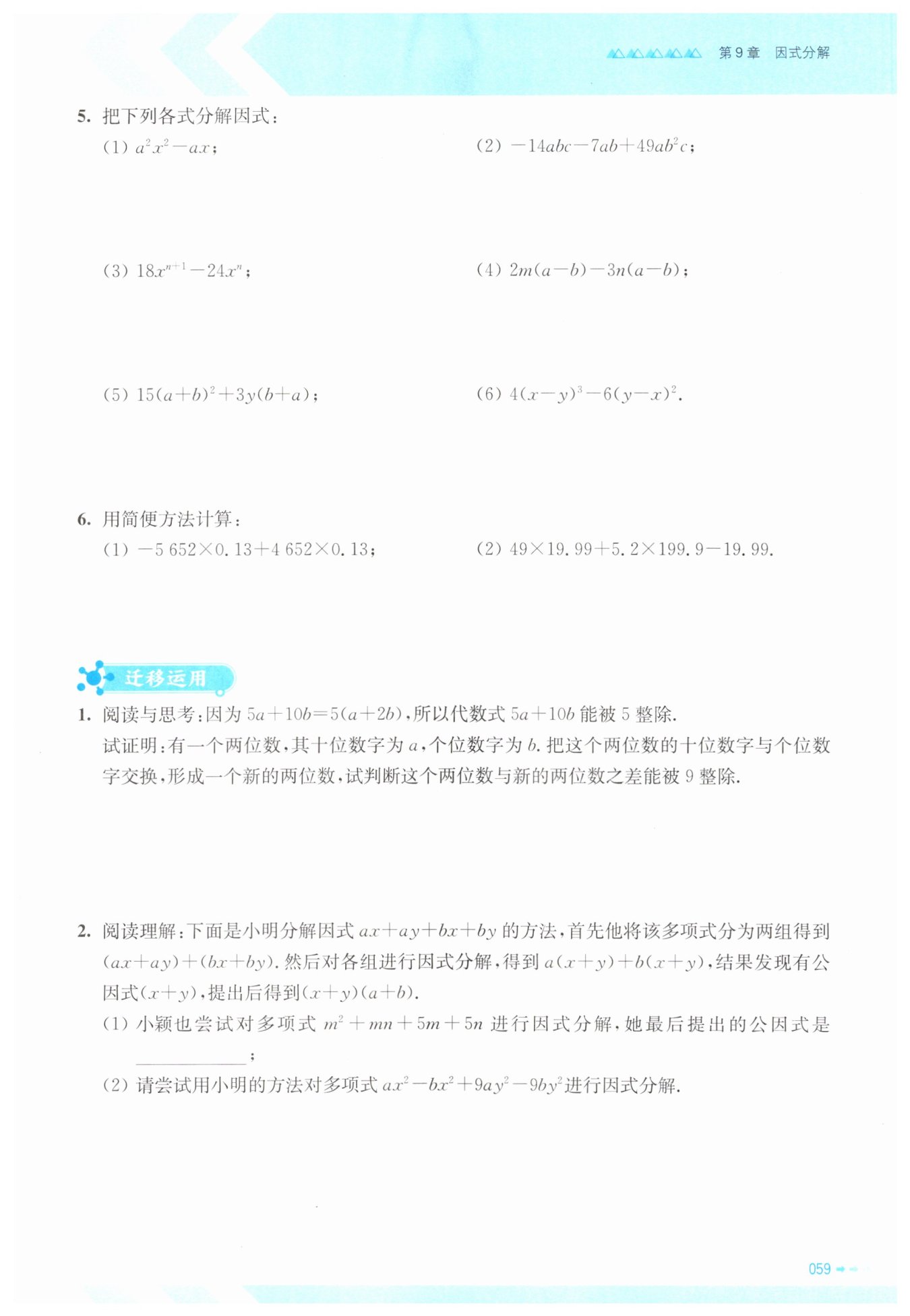 1. 提取公因式法分解因式;2. 整体思想在因式分解中的应用;3. 公因式的确定