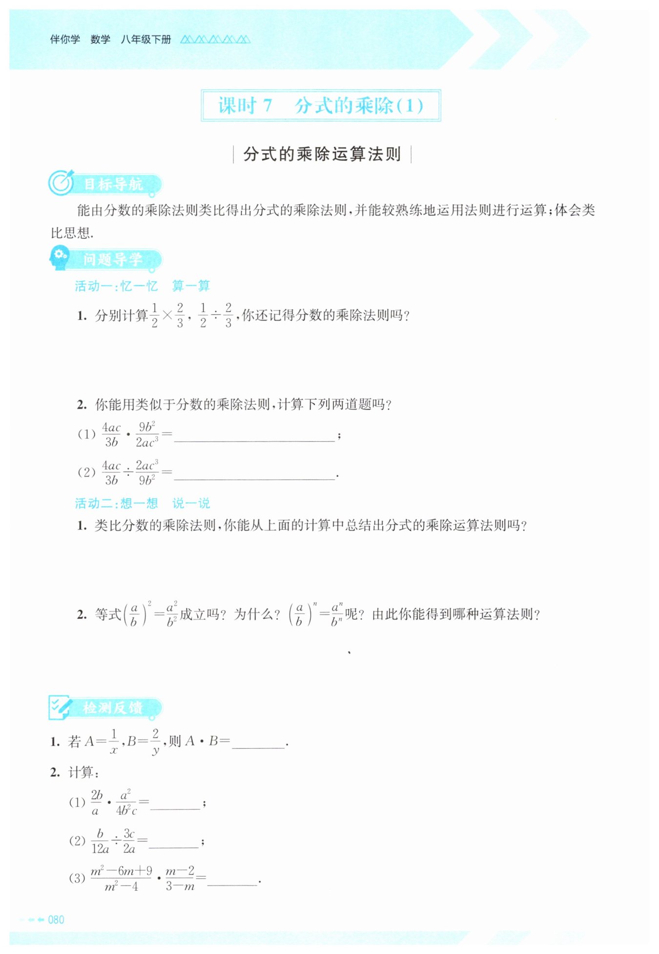 本题通过回忆分数乘除运算,类比推导分式乘除运算,建立新旧知识的联系,帮助掌握分式乘除的计算方法,提升知识迁移与运算能力。
