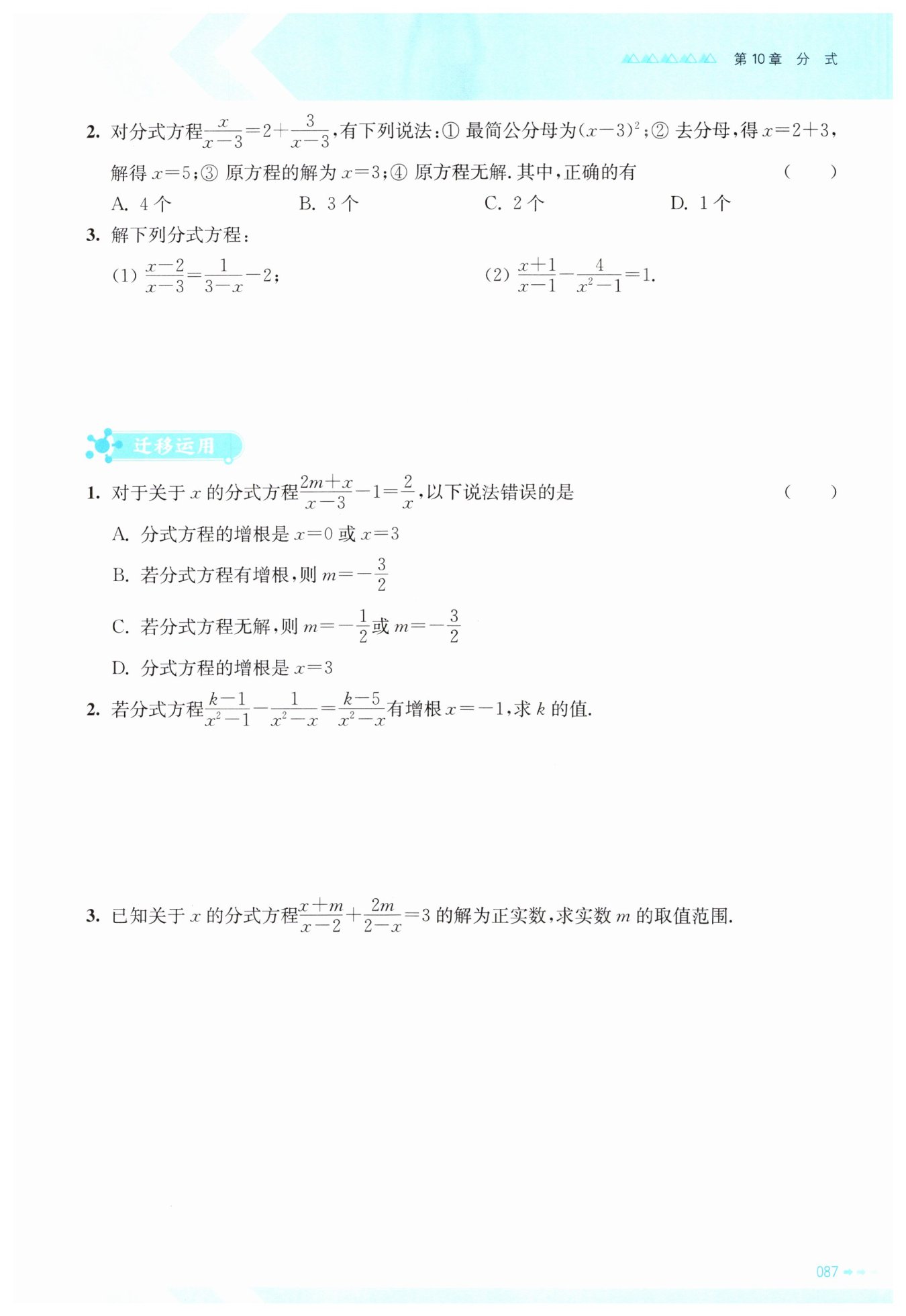 3. 方程求解与检验:化简方程得$x=2x-6+3$,解得$x=3$,但$x=3$会使原方程的分母为0,是增根,因此原方程无解,故说法③错误,④正确。