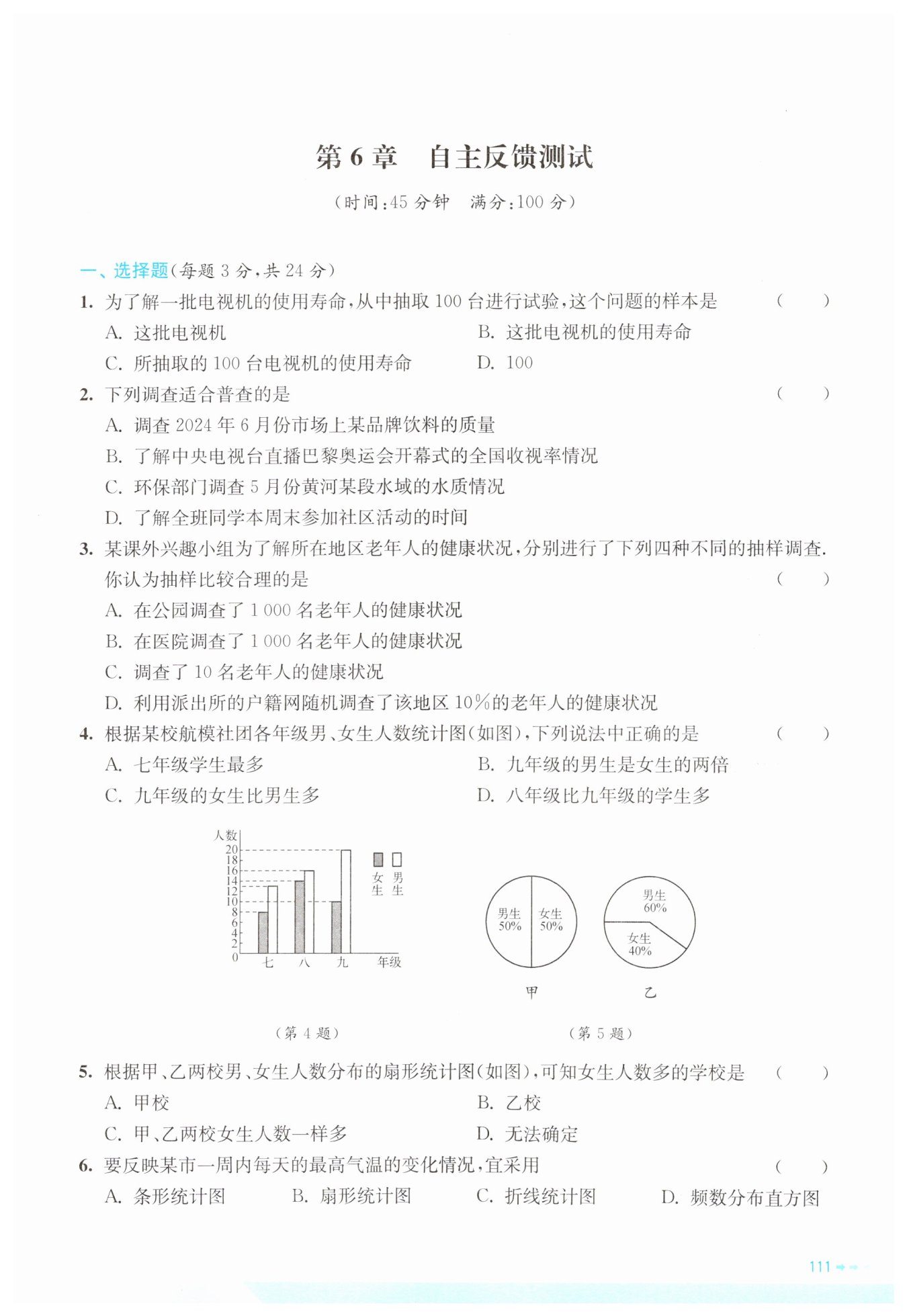 B. 九年级男生20人,女生10人,$20÷10=2$,即九年级的男生是女生的两倍,该选项正确;