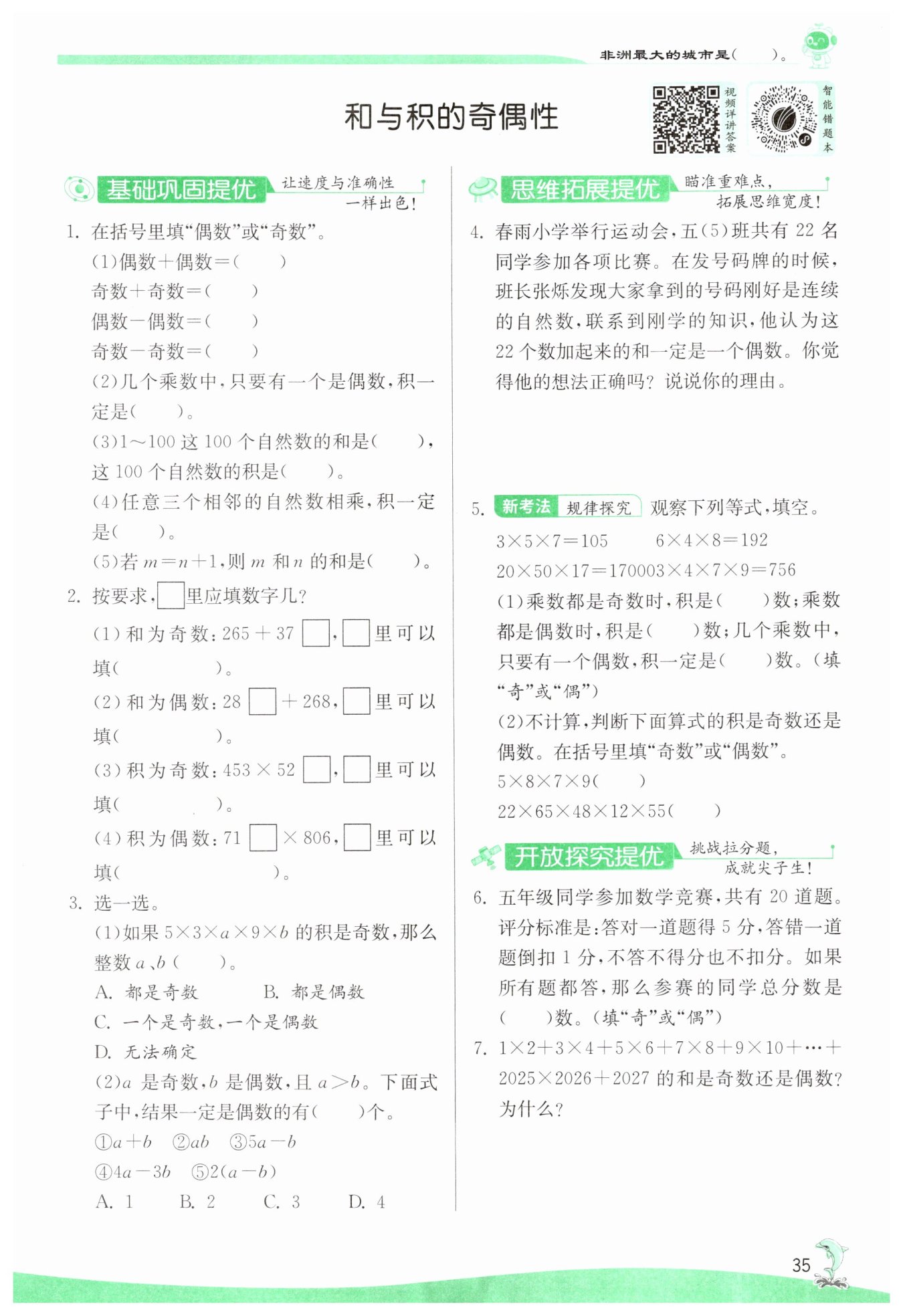答:奇数。因为1×2,3×4,5×6,…每个算式的两个因数中都有一个偶数,所以积都是偶数,即在整个算式中,除了最后一个加数2027是奇数以外,所有的加数都是偶数,所以最后的和是奇数。