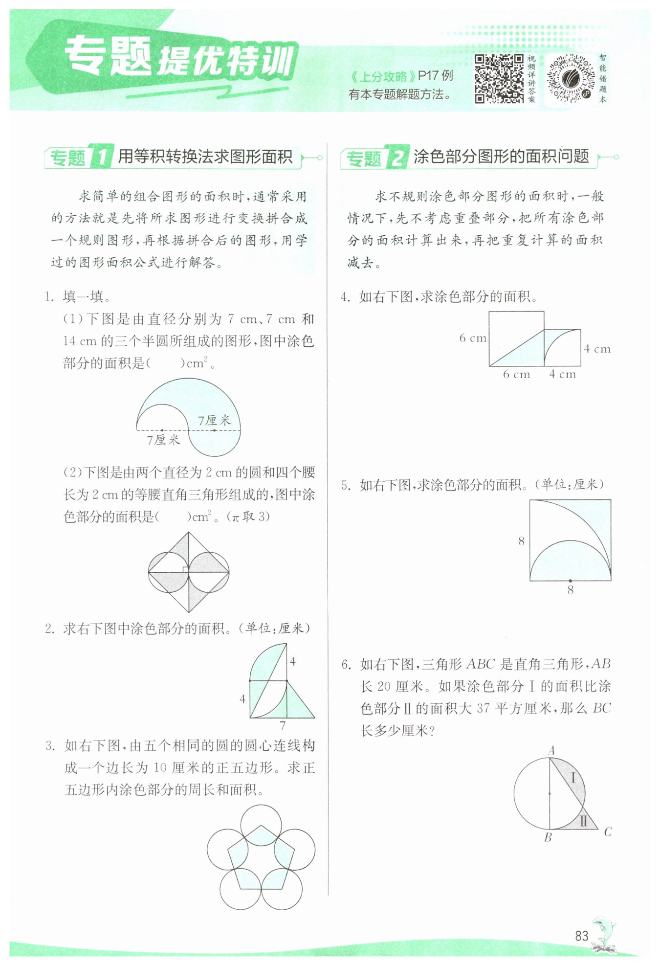 答:正五边形内涂色部分的周长是$97.1$厘米,面积是$117.75$平方厘米。